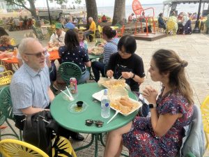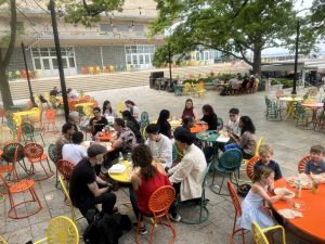 Dept. of Psychology and Neuroscience Training Program trainees lunching al fresco with MSMC speakers at the Memorial Union Terrace